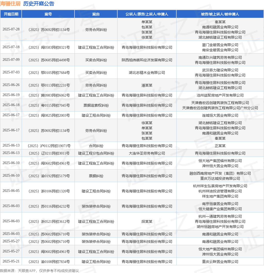 案号:(2025)粤0115民初7045号审理法院:广州市南沙区人民法院案由:票据追索权纠纷当事人信息: 原告/上诉人:青岛海骊住居科技股份有限公司 被告/被上诉人:天津鑫宏远创建筑装饰工程有限公司、天津鑫宏远创建筑装饰工程有限公司广州分公司开庭日期:2025年6月18日根据统计,近一年内以青岛海骊住居科技股份有限公司为当事人的历史开庭公告有171则,其中案由为“建设工程合同纠纷”的公告以34则居首,其次为“建设工程施工合同纠纷”有29则,“装饰装修合同纠纷”有21则。历史开庭公告(前20条)如下: