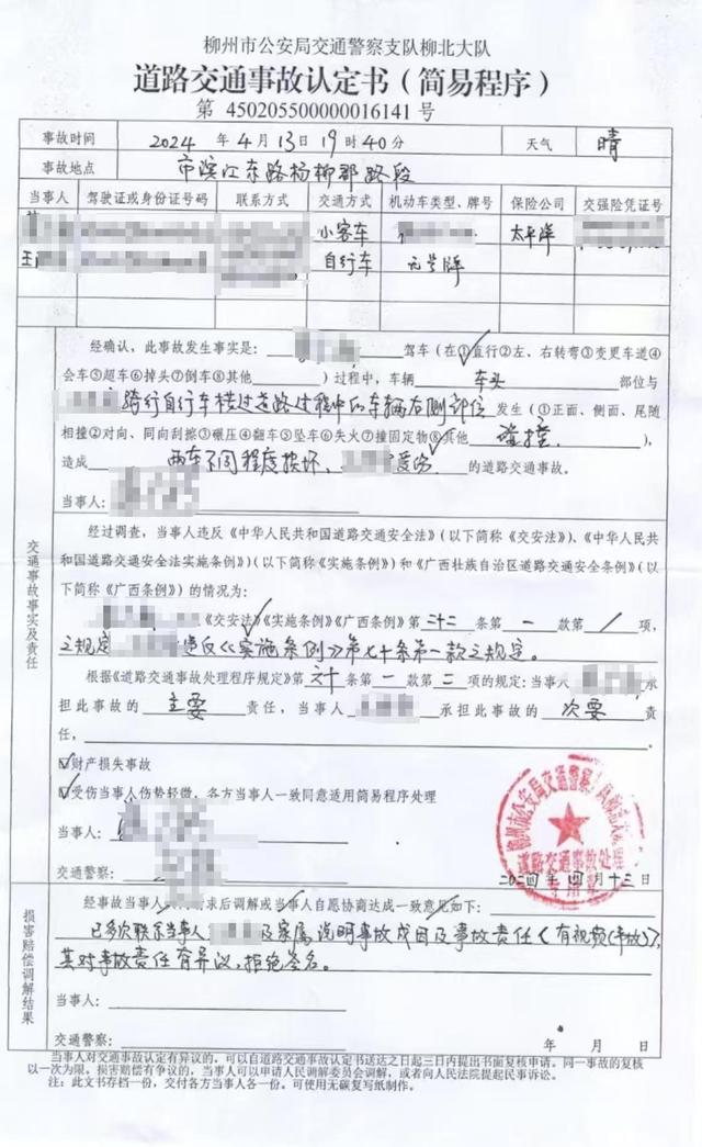 事发当晚,柳北交警大队出具的《道路交通事故认定书(简易程序)》显示,受伤当事人伤势轻微,各方当事人一致同意适用简易程序处理。