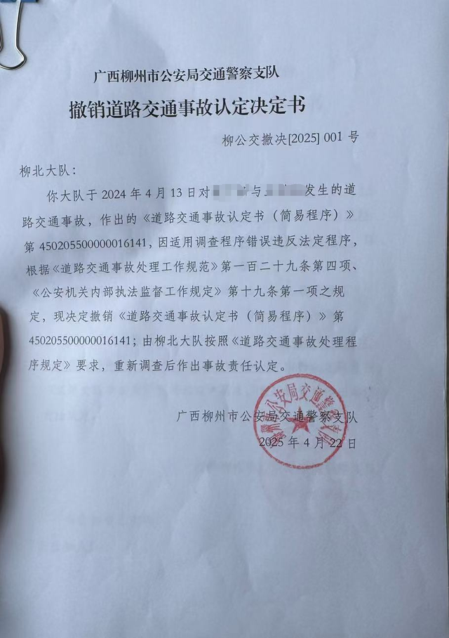 2025年4月22日,柳州市公安局交警支队出具《撤销道路交通事故认定决定书》,由柳北大队2024年4月13日作出的道路交通事故认定书,因适用调查程序错误违反法定程序,根据《道路交通事故处理工作规范》《公安机关内部执法监督工作规定》,决定撤销,由柳北大队按照程序规定要求,重新调查后作出事故责任认定。