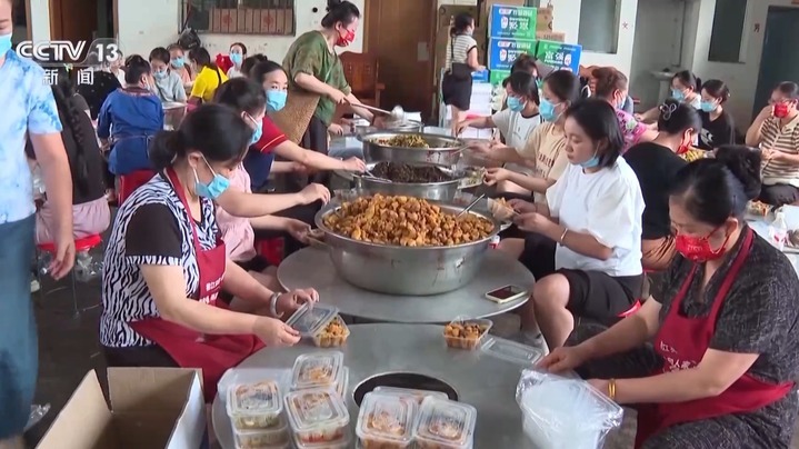 忠诚村由于地处上游,并未遭遇洪灾影响,该村拉拉队的阿姨们也决定要为这场暴雨撑一把伞。她们带着菜刀、穿着围裙,开始给救援队员及受灾群众做盒饭。洗菜、切菜、炒菜、分装,200多位阿姨分工明确,周三开始,每天能提供6000多份。小瑞村的杨玉碧经营饭店,是位大厨,救援人员帮助她清理淤泥,她则跑来为救援人员做盒饭。