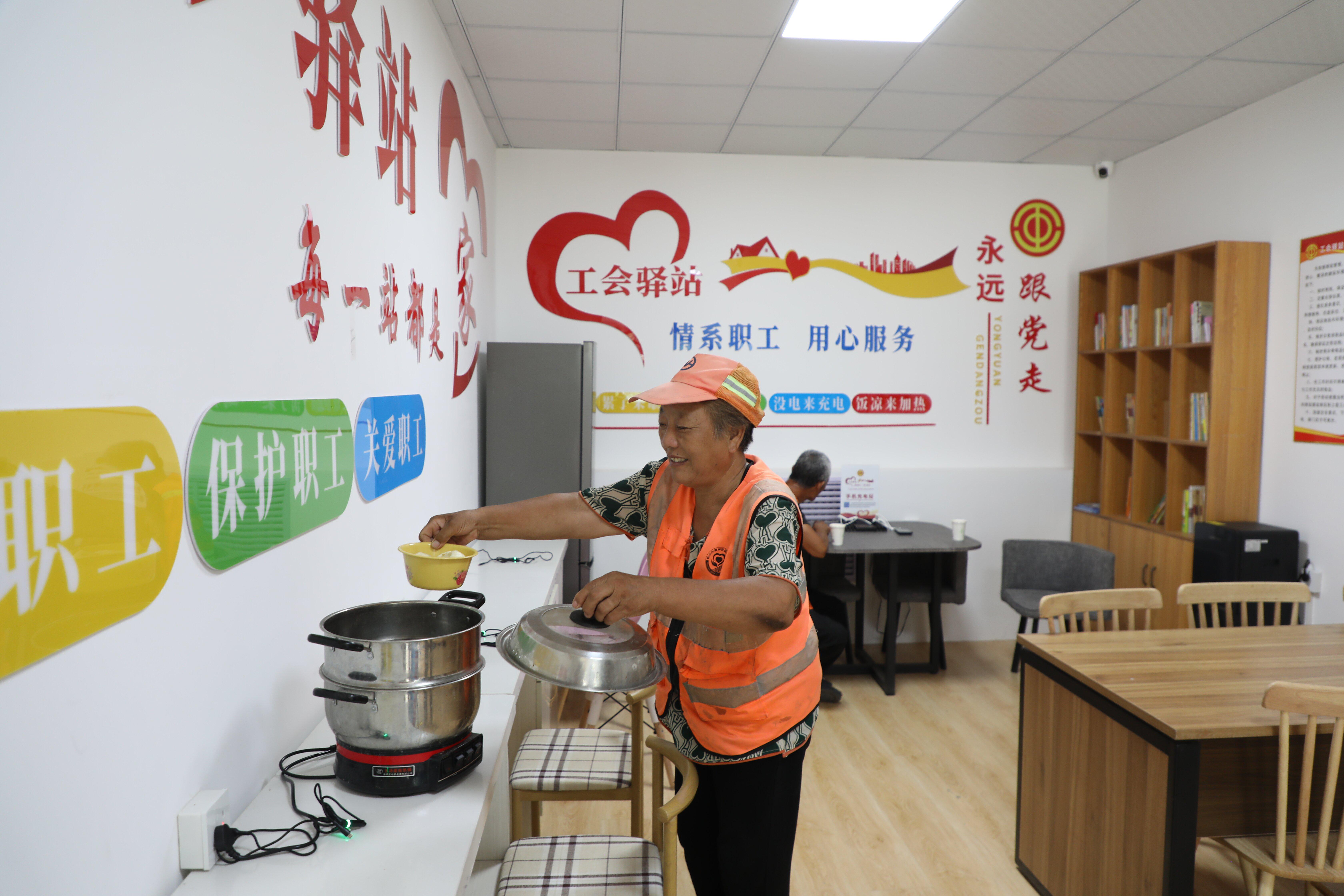 7月2日,在衡水市冀州区24小时智能工会驿站内,一名环卫工人正在加热午餐。(受访单位供图)