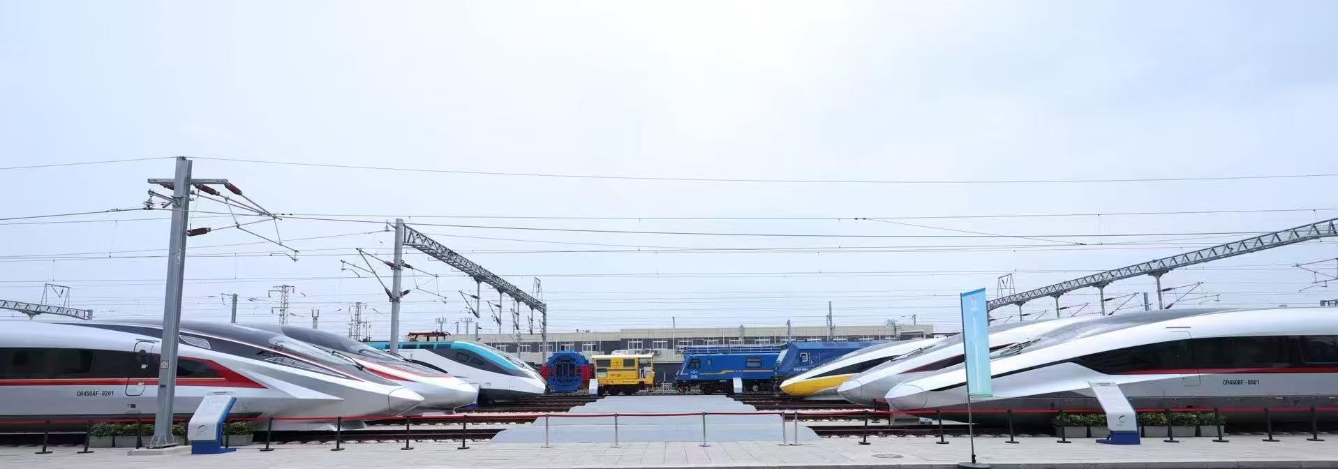 图为国家铁道试验中心展区展出的车辆,前左和前右分别为CR450AF动车组和CR450BF动车组。 新华社记者 樊曦 摄